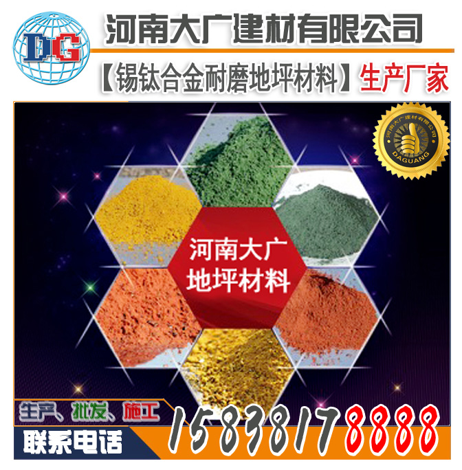 大廣牌錫鈦合金合耐磨地坪材料由一定顆粒級配的錫鈦合金骨料、高標號水泥、顏料、微硅粉等其它摻合料和外加劑組成。將其均勻地撒布在初凝階段的混凝土表面,經(jīng)專工門工藝加工,從而使其與混凝土地面形成一個整體。且具有高致密度性和著色的高性能耐磨地面。